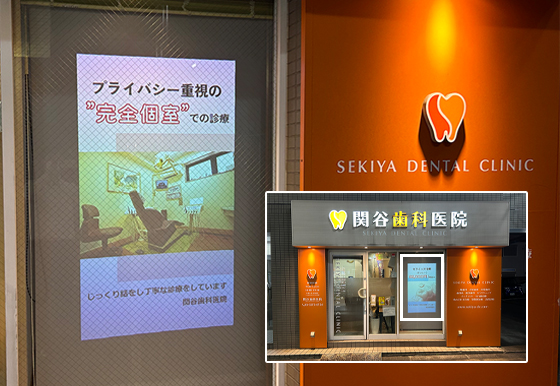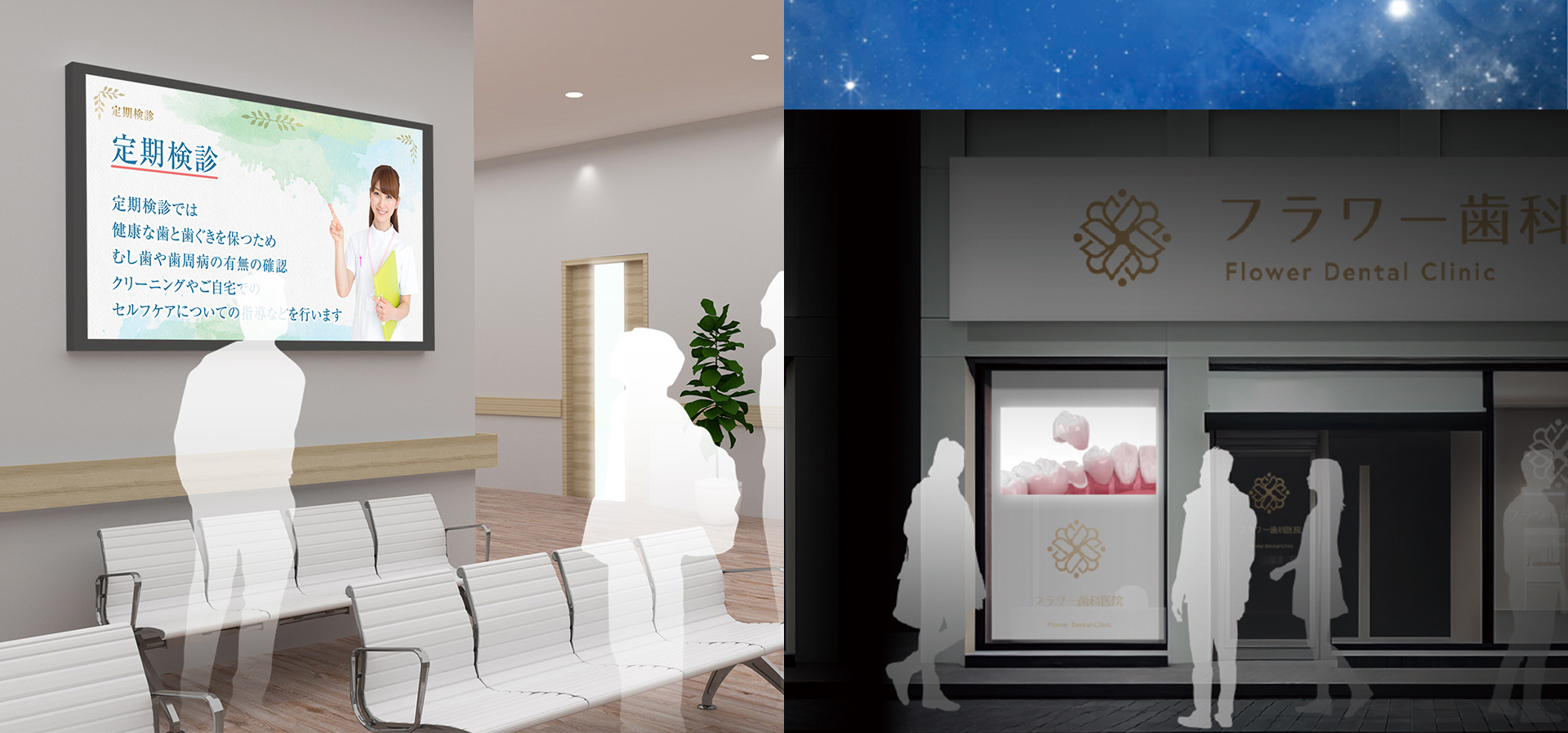路面にそって入口、診療室があり、診療室の一部にマド・アテンションを導入しました。夜間でも人通りがある道路沿いの歯科医院様で、地域の方や仕事帰りの方へ向けて動画を配信しています。
